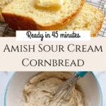 This Amish Sour Cream Cornbread is a moist and tender bread featuring a perfect balance of sweet and tangy flavors. Made with a combination of all-purpose flour, cornmeal, sour cream, and a touch of sugar, it’s a traditional recipe that bakes up golden brown with a soft crumb. Ideal for serving warm slathered with butter, this quick and easy cornbread is baked in a loaf pan, making it perfect for slicing and enjoying alongside soups, stews, or as a comforting snack.