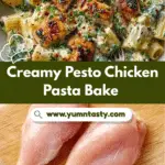 This Creamy Pesto Chicken Pasta is a comforting and flavorful baked pasta dish featuring tender sautéed chicken, al dente pasta, and a rich, creamy pesto sauce topped with mozzarella and Parmesan cheese. Perfect for a satisfying weeknight dinner, it combines fresh basil pesto with heavy cream and garlic for a luscious sauce baked to golden perfection.