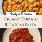 This creamy tomato rigatoni pasta is a quick and comforting meal combining perfectly cooked rigatoni with a luscious sauce made from butter, onions, garlic, cream, and tomato pasta sauce. The sauce is lightly seasoned with Italian herbs and a touch of heat from crushed red pepper flakes, then finished with freshly grated Parmesan cheese for an indulgent yet simple dinner.