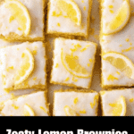 - Glaze and Serve: Using the parchment overhang, carefully lift the cooled brownies out of the pan. Drizzle the lemon glaze evenly over the brownies and sprinkle with extra lemon zest for an added burst of flavor. Cut into squares and serve.