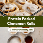 With a few substitutions like plant-based yogurt and cream cheese, maple syrup instead of honey, and a vegan protein powder, you can absolutely craft vegan-friendly cinnamon rolls from this recipe.