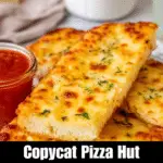 These Pizza Hut Cheese Sticks are a delicious homemade copycat recipe featuring soft, buttery dough topped with gooey melted mozzarella and parmesan, seasoned with garlic and oregano, and baked to golden perfection. Perfect for serving as an appetizer or side dish with your favorite meals, these cheese sticks come with marinara sauce for dipping.