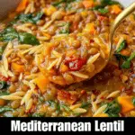 This Mediterranean Lentil and Orzo recipe is a wholesome, high-protein one-pot meal bursting with fiber, fresh vegetables, and vibrant Mediterranean flavors. Ready in just 30 minutes, it combines tender lentils, sweet cherry tomatoes, and nutrient-rich spinach with fragrant herbs and orzo pasta for a cozy and easy-to-make dinner perfect for any weeknight.