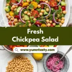 This vibrant and protein-packed Chickpea Salad features nutritious garbanzo beans combined with fresh cherry tomatoes, crisp cucumber, tangy pickled red onions, Kalamata olives, and aromatic herbs. Tossed in a zesty lemon dressing with garlic and Dijon mustard, it’s a refreshing, healthy salad perfect for picnic side dishes or a wholesome lunch.
