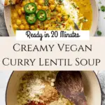 This hearty Vegan Curry Lentil Soup is a comforting blend of classic curry spices, garbanzo beans, and red lentils simmered in creamy coconut milk and vegetable broth. Perfect for a quick, nutritious meal, it delivers rich flavors and wholesome ingredients, all ready in just 20 minutes.